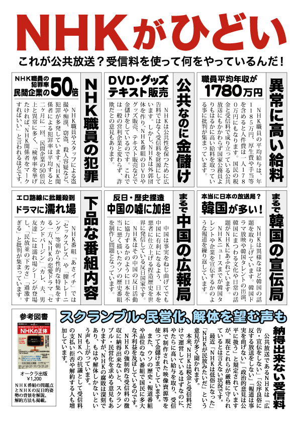 頑張れ日本!全国行動委員会では、NHKをはじめ偏向報道を繰り返す既存の反日マスコミに対抗するため、ポスティング活動を行っております。チラシの印刷代などに経費がかさみますので、趣旨にご賛同いただけご支援頂ける場合には、下記口座宛にお振り込みをお願いいたします。
